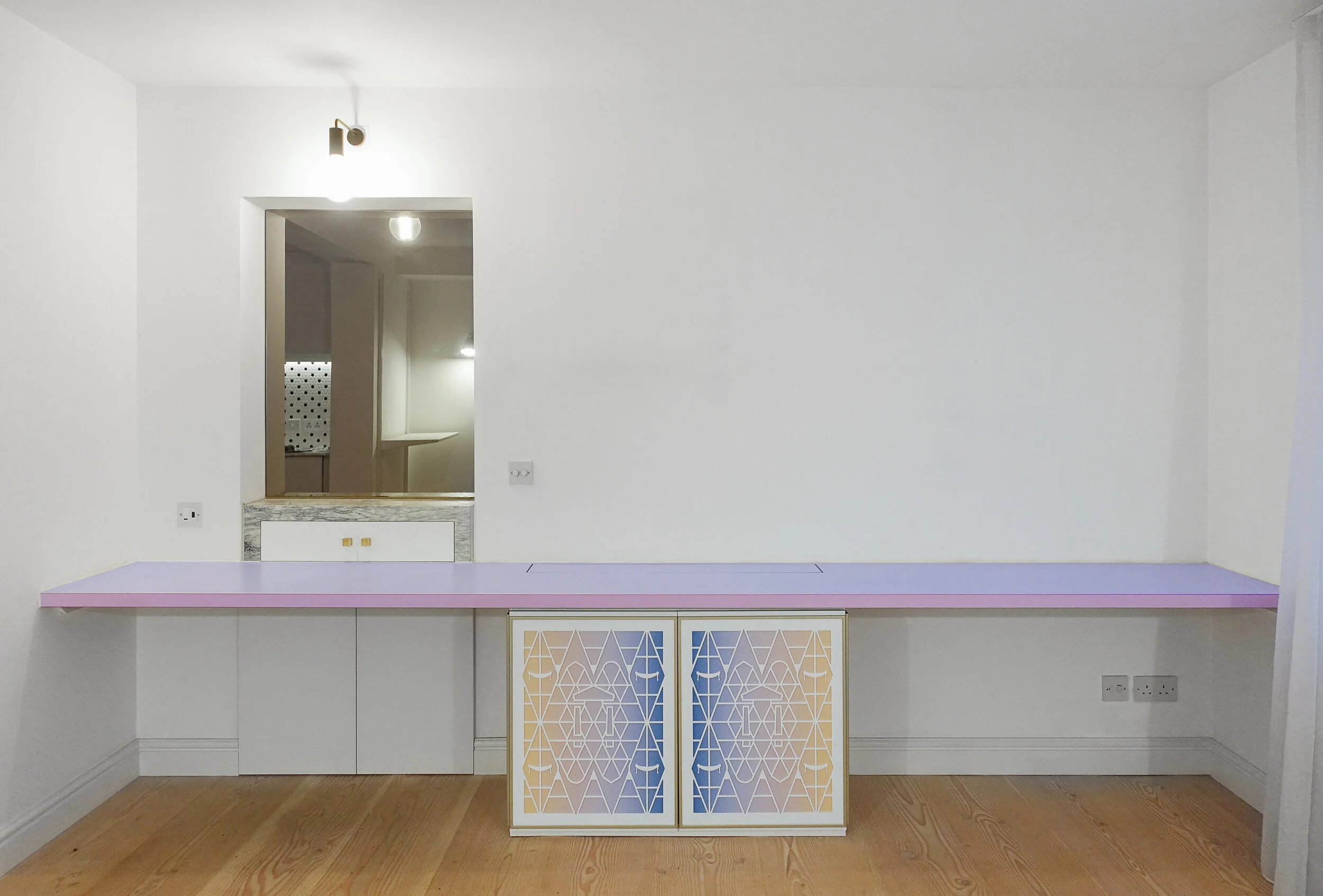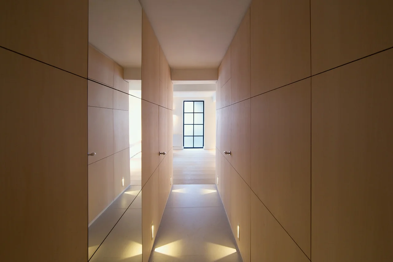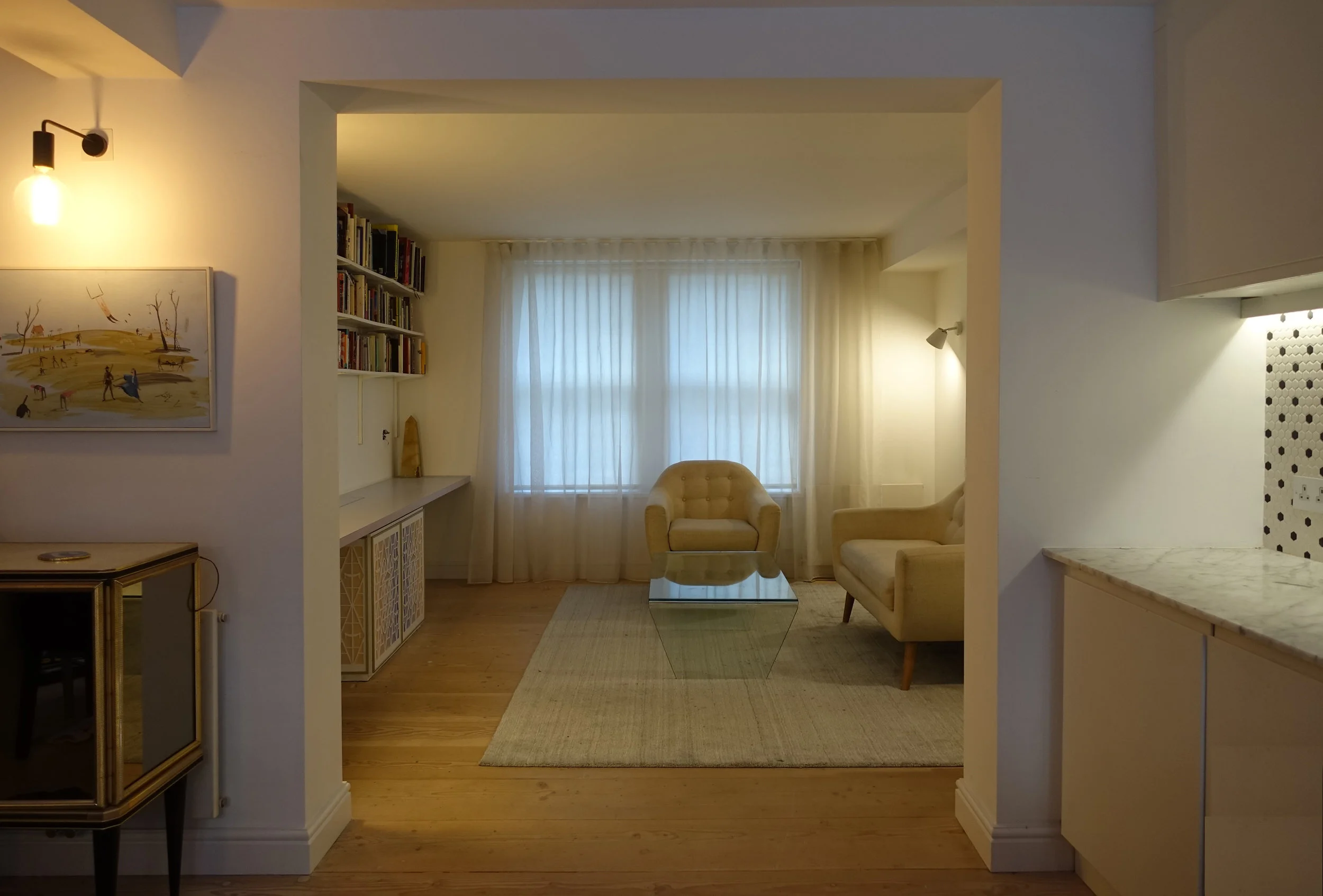 This project transformed an unloved and warren-like Central London lower ground floor flat by removing almost all interior walls to allow light into it’s centre. The ambition of the scheme was to remove visual clutter, to create a calm and refined interior that celebrated materiality. All surfaces, services, fixtures and fittings were also replaced. The project was come- pleted in two phases, which allowed for significant and efficient design alterations inbetween phases.