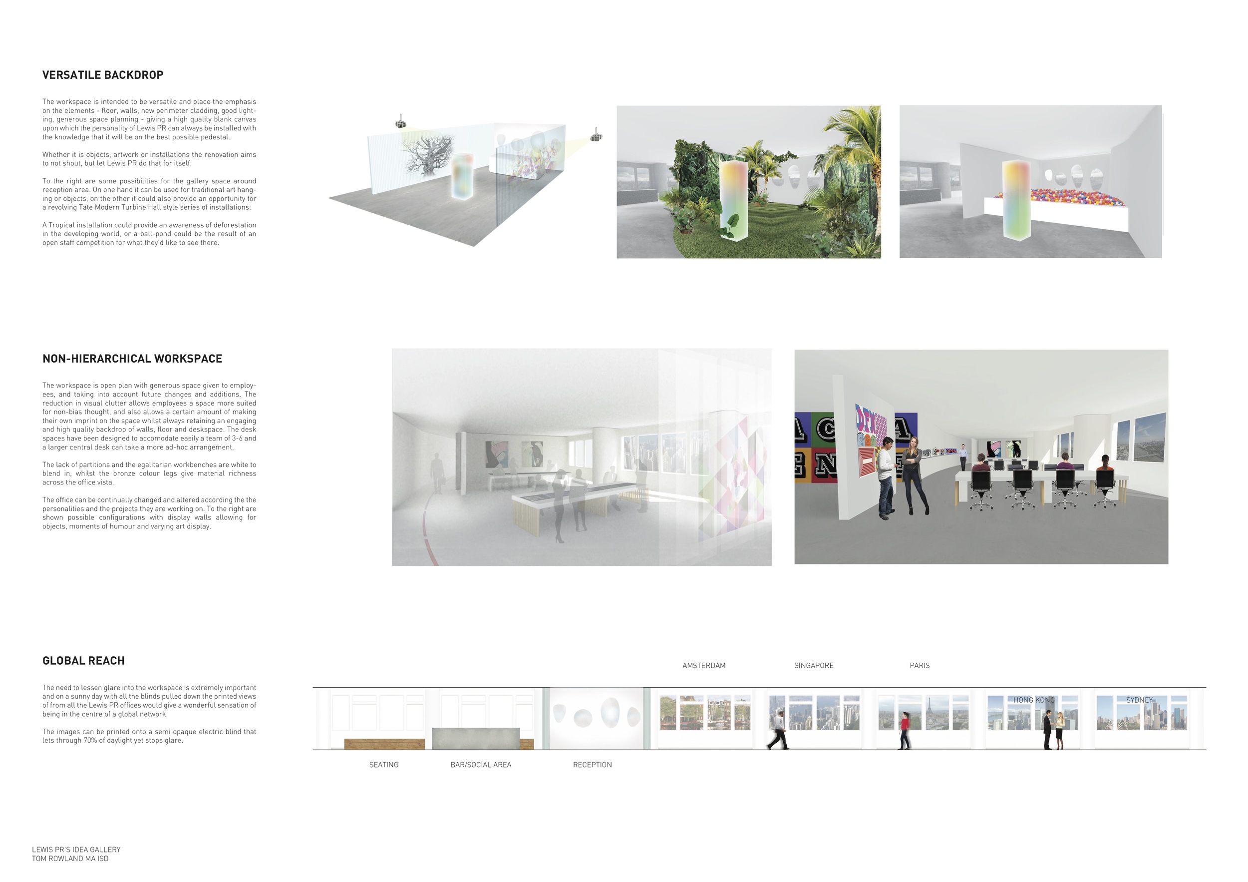 Lewis PR held an open competition to renovate the Millbank Tower HQ of their 24-site global business. The proposal foregrounded the company’s use of technology and aimed to reduce the psychological distance between the online and physical worlds that the business operates in. This was to be achieved via new digital interfaces that displayed the outputs of the other global offices to create hightened connectivity between them. A space for showing revolving gallery exhibitions was also included in the proposal.